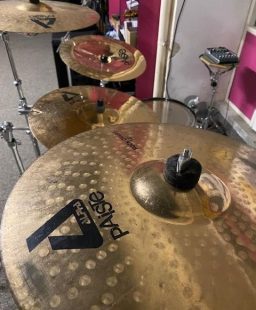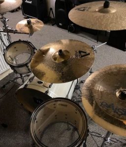 versucht seine Trommelschläge möglichst gleichmäßig über alle Toms und Becken zu verteilen
